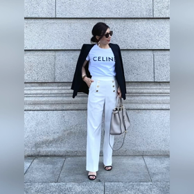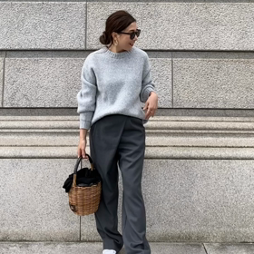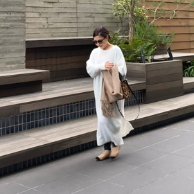 白ニットワンピをレザーパンツ合わせで甘辛に