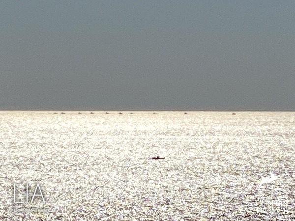 イルカを追い込む時にとられる船の配置で、一列に並ぶバンガーボートを確認。