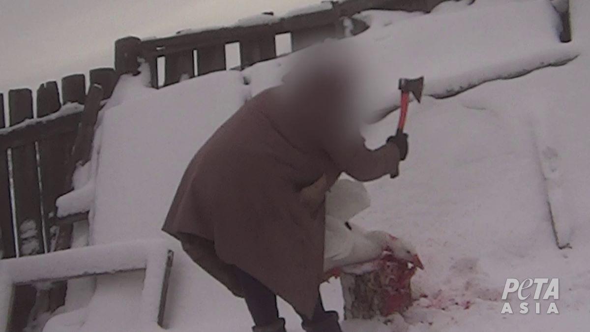 ある農場のガチョウは痛み止めも受けず、気絶せずに切り株に首を伸ばし、斧で繰り返し切り刻まれました。
