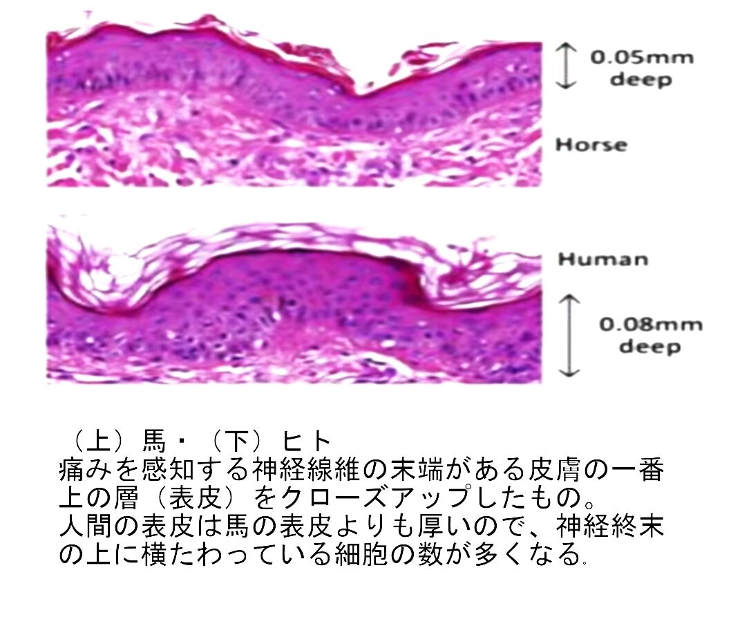 しかし表皮で見れば、ヒトが0.08mmなのに対し、馬は0.05mmであり、馬の表皮はヒトの表皮よりも薄いことが分かる。