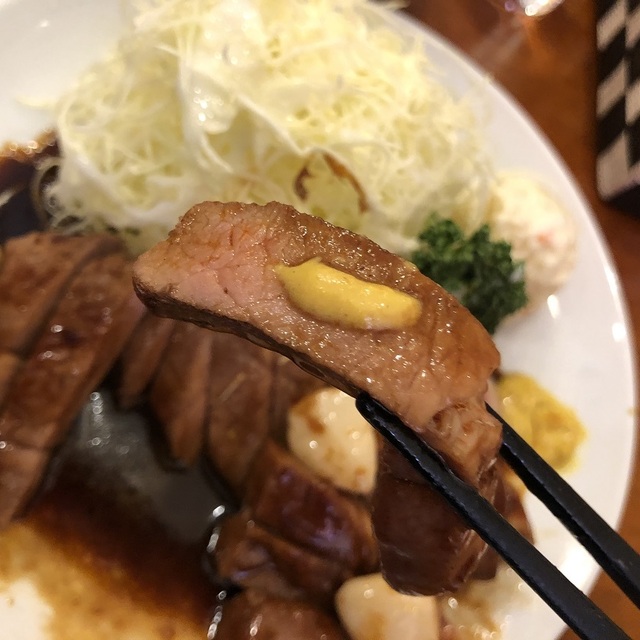 とんてきの方はとんかつソースベースのタレで米絶対に合うタイプ。ワシワシ米も食えて、たっぷりのキャベツに、ポテサラと和辛子で2枚の肉でも飽きずに大変美味しい!