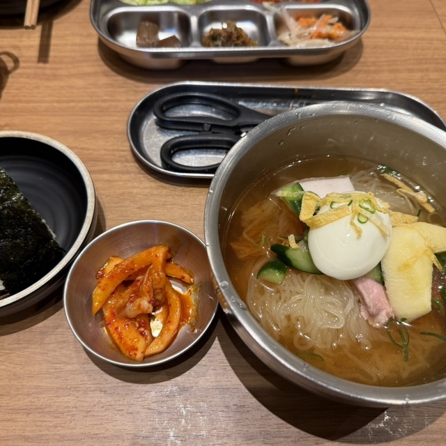 ウマ>゜))))彡ぁああああああああああああああ!やっぱここの冷麺はメッチャ美味い。スープはさっぱりしているけど旨味が有ってコク深く酢を加えるとキリッとして更に美味い。麺は細いけど腰もシッカリあるけど固くて嫌になる事も無くスルスルと啜れば切らずに咀嚼も簡単。風味も良いし乗ってる具材と喧嘩せず韓国で食べるより美味しいと思う。