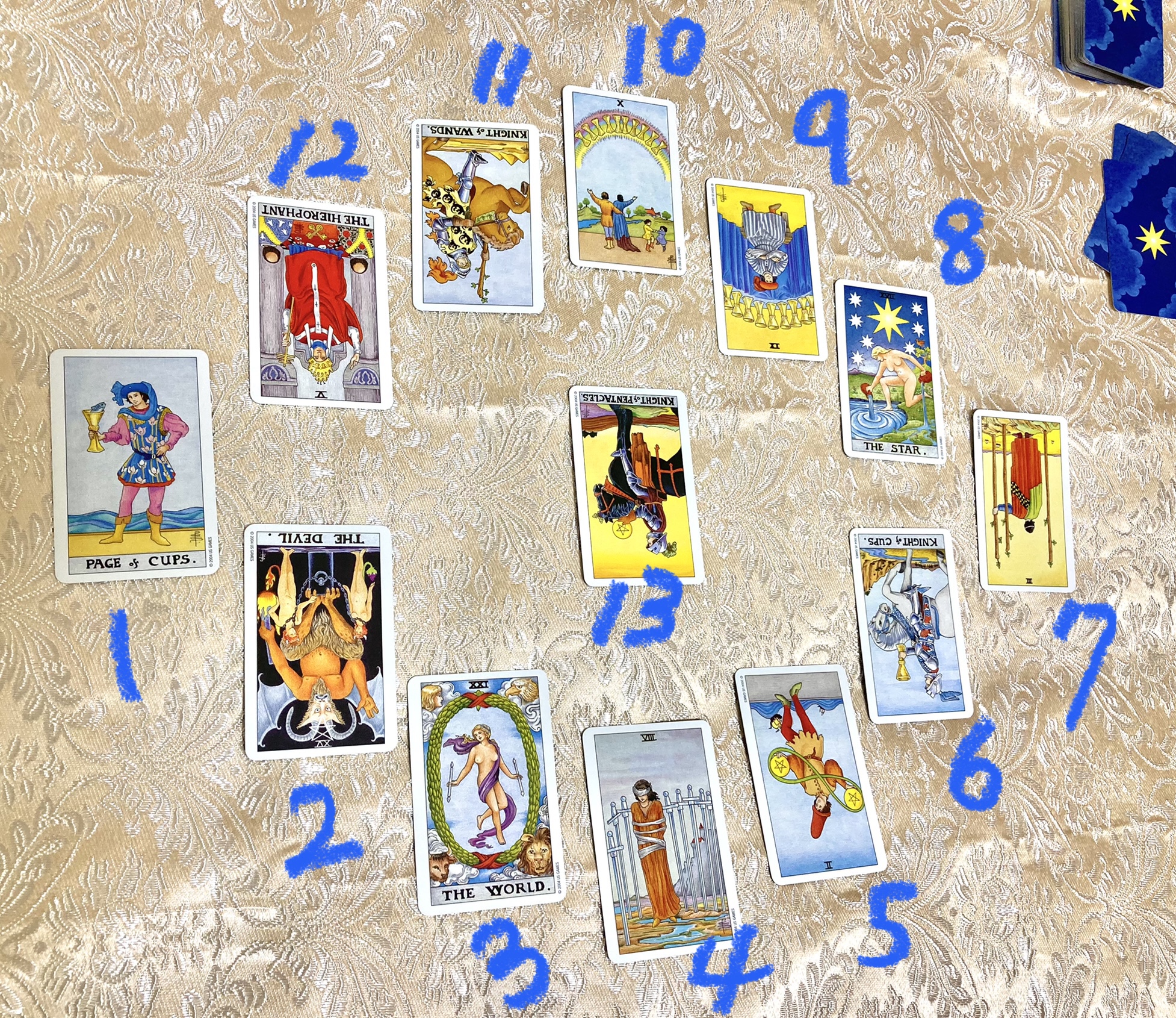 ホロスコープスプレッドは、左(時計で表現すると、9時の位置)から1枚めを置いていきます。