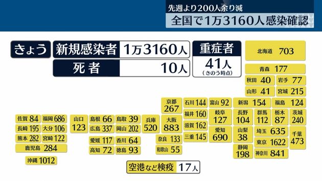 全国の新たな新型コロナウイルスへの感染者は1万3160人で、1週間前よりおよそ200人減少しています。全国では新たに10人の方が亡くなりました。