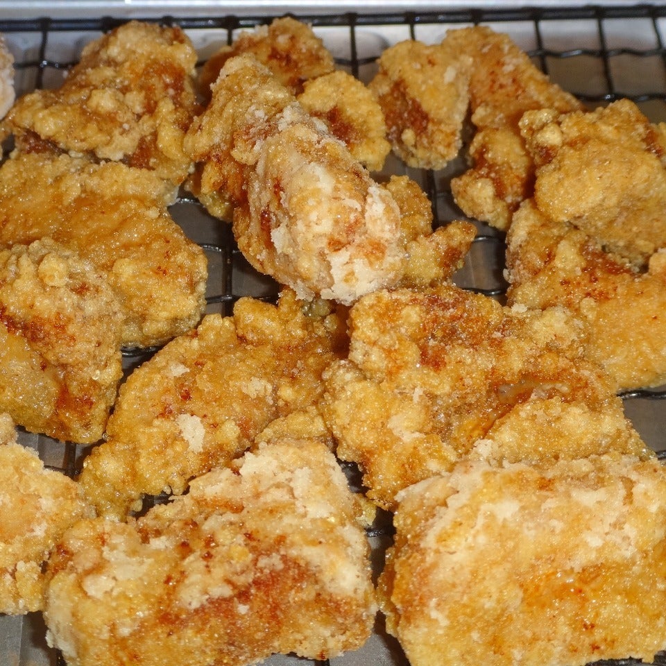 30分寝かせた豚肉に片栗粉をまぶし、180℃のサラダ油でカラッと揚げます。