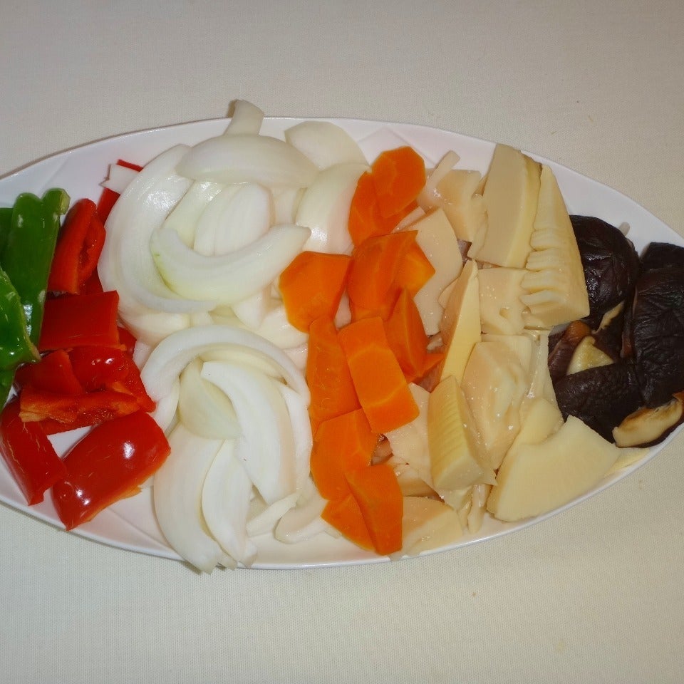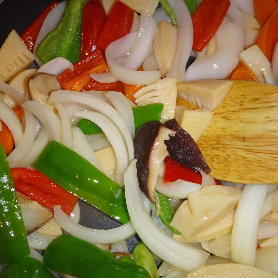 熱したフライパンにオリーブオイル(大さじ2)を入れ、たまねぎをよく炒めてからにんじん・筍・干し椎茸・赤ピーマン・青ピーマンの順に加えを強火でよく炒めます。炒められたら火を止めます。