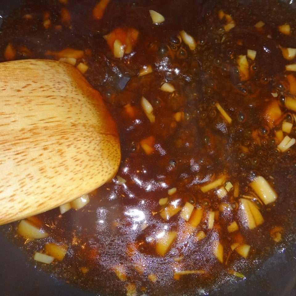 別の小さいフライパンにオリーブオイルを加えみじん切りにしたニンニクを中火で軽く炒め、固形のコンソメ(1/2個)と120ccのお湯を入れ酢・砂糖・醤油各大さじ3を加えかき混ぜ 溶き片栗粉(大さじ1の片栗粉を大さじ1の水で溶いたもの)を中央から円を描くように流し、素早くかき混ぜとろみをつけます。