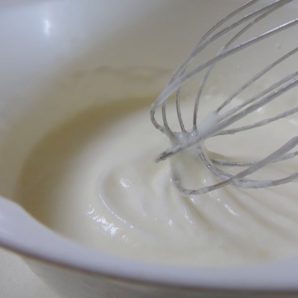 白身はボウルにて 泡立て器でメレンゲにして、