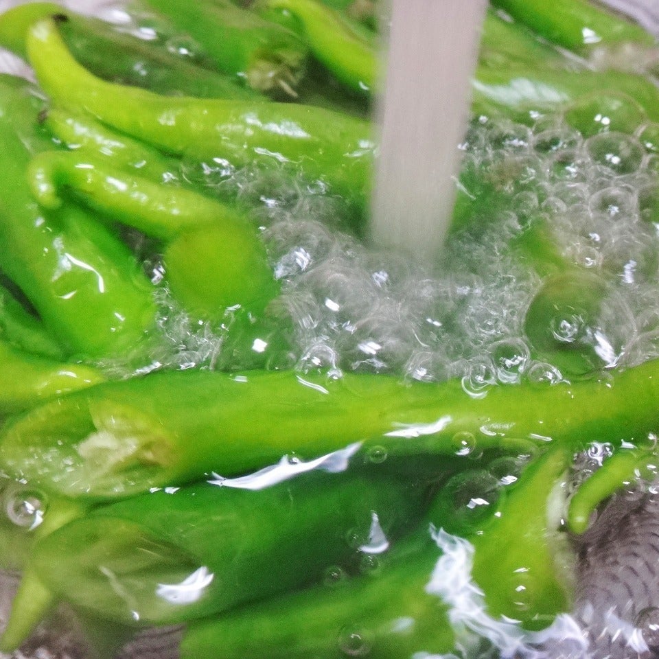 甘長唐辛子を指先で軽くねじりながら、種を取ります。