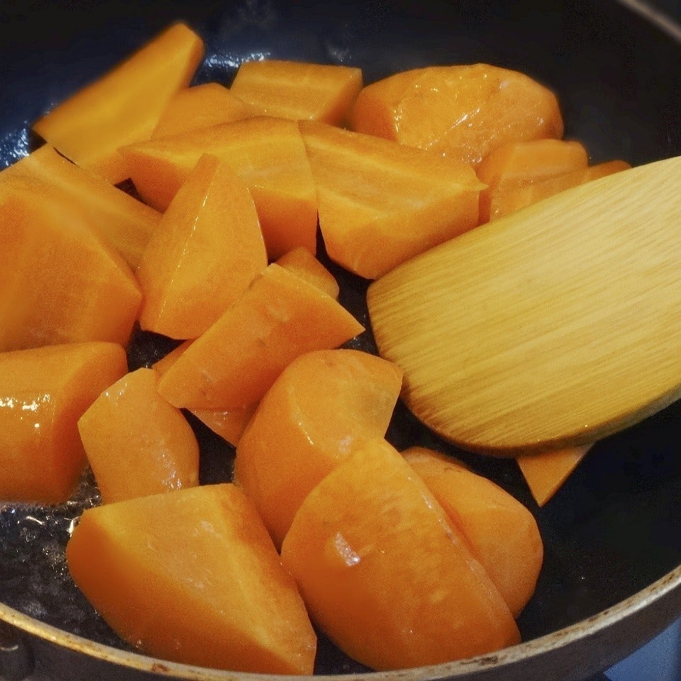 中火でにんじんに絡め、やわらかくなるまで炒めます。