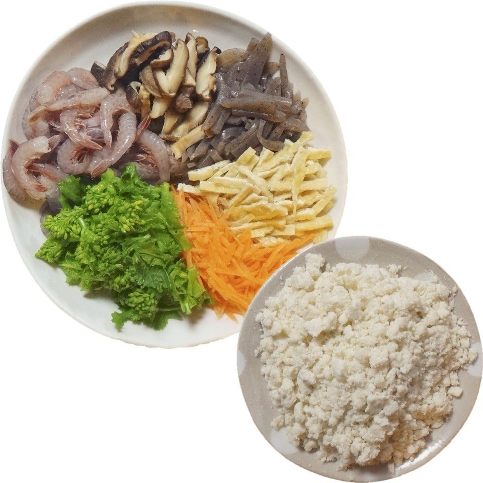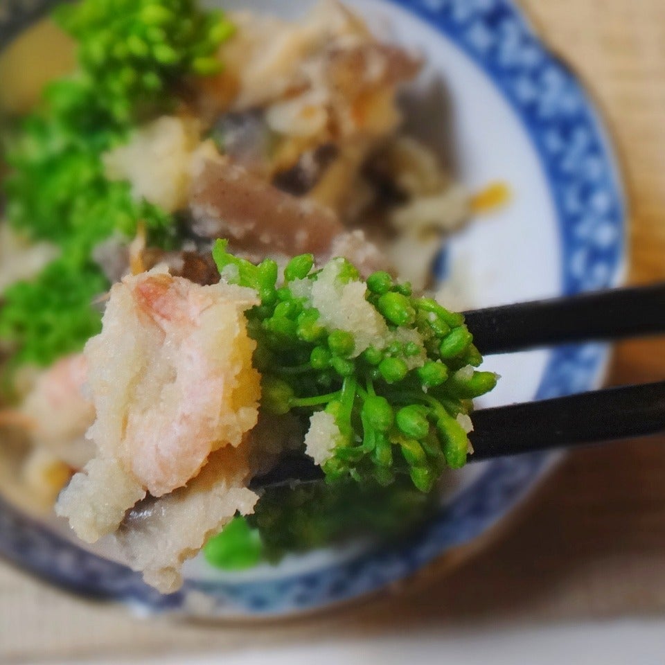 おから(250g) 小海老(200g) 菜の花(2/3束) にんじん(1/3本) こんにゃく(1/2丁)