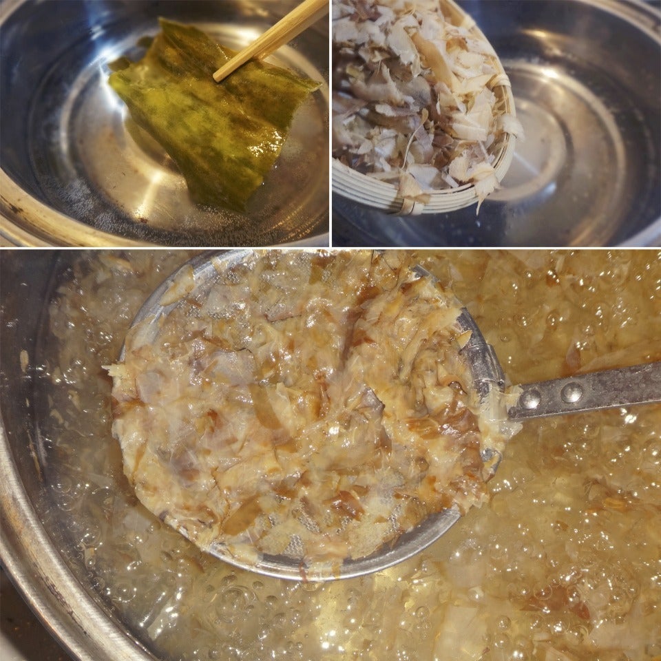 沸騰する直前に、昆布を取り出し だし鰹(5g)を加え、3分煮てアミですくい出します。