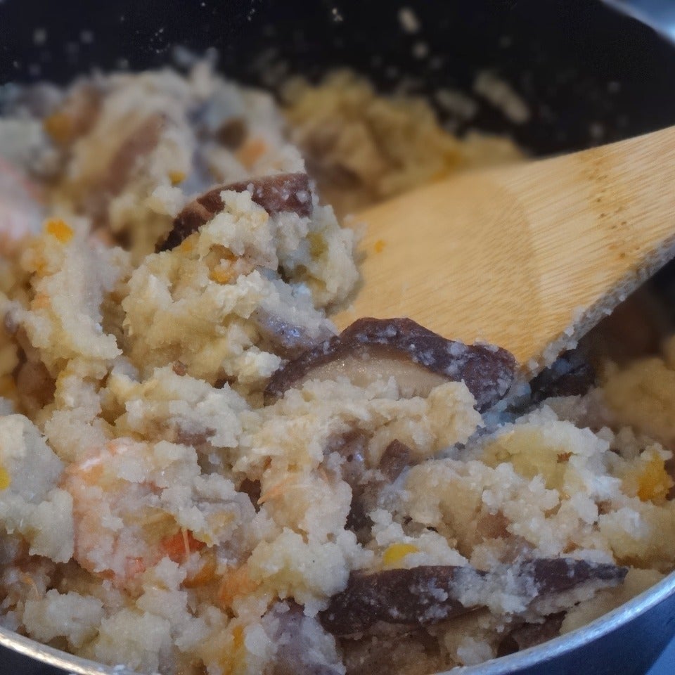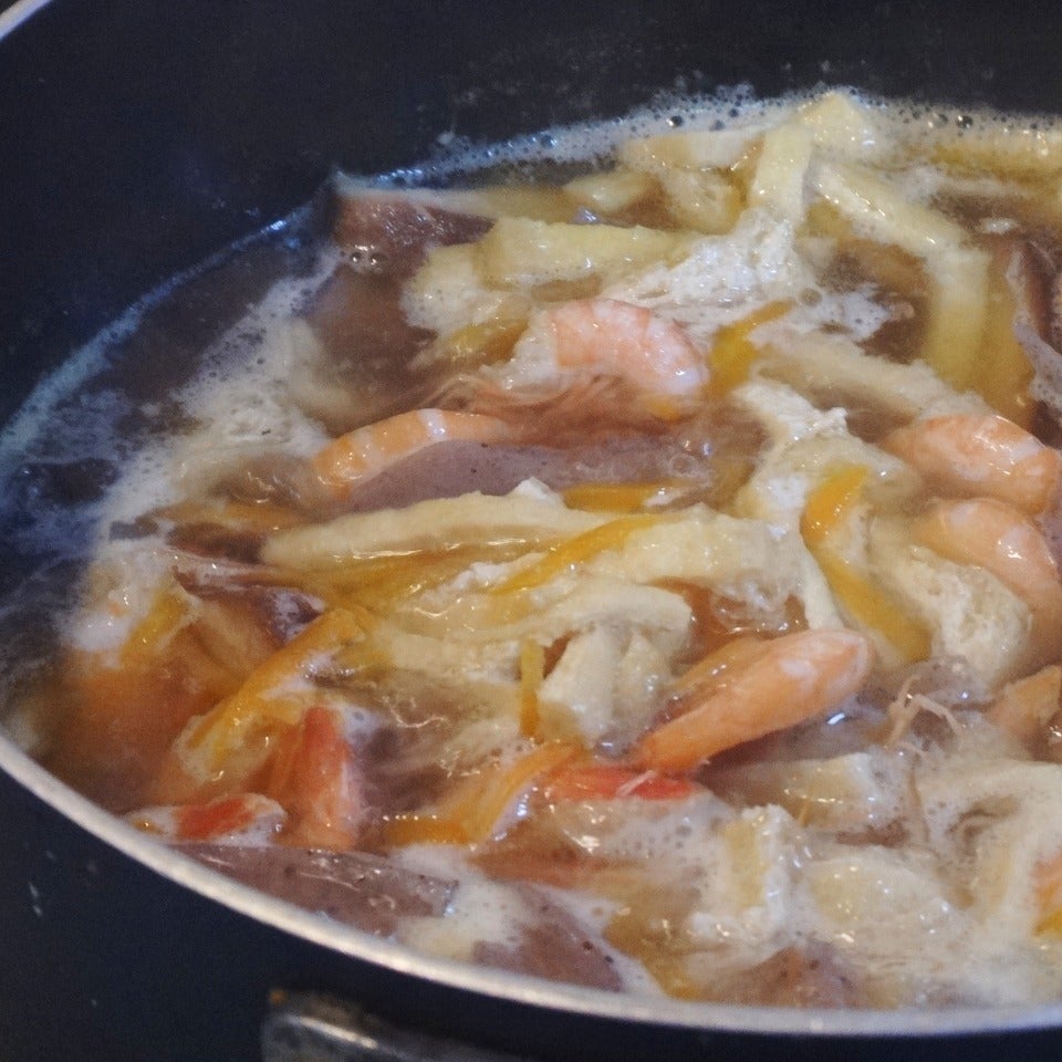沸騰したら、火を弱めじゃこ海老と酒(大さじ2)みりん(大さじ1)を加え、