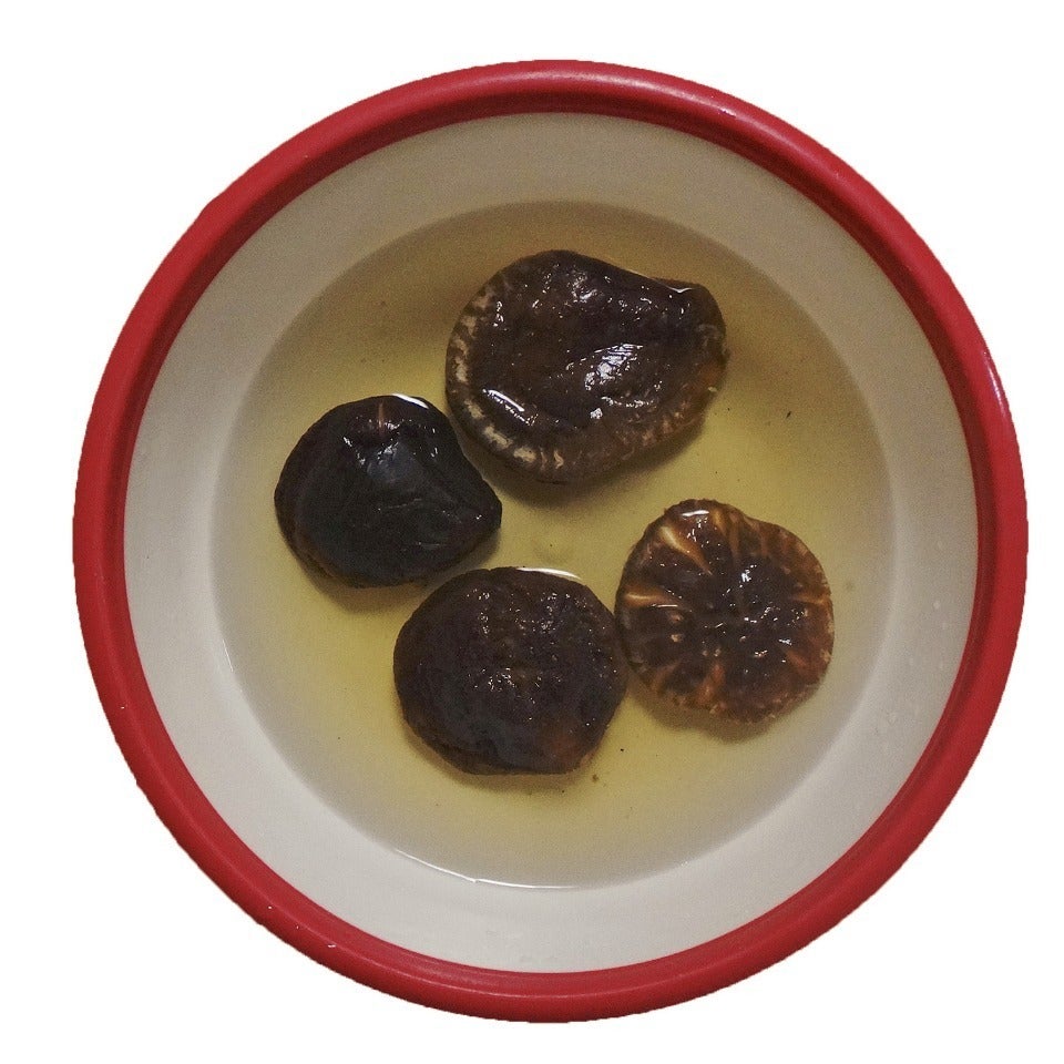 戻り水は捨てずに容器に移し、椎茸は縦4等分に切ります。