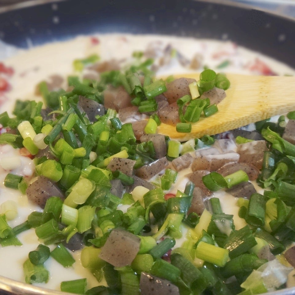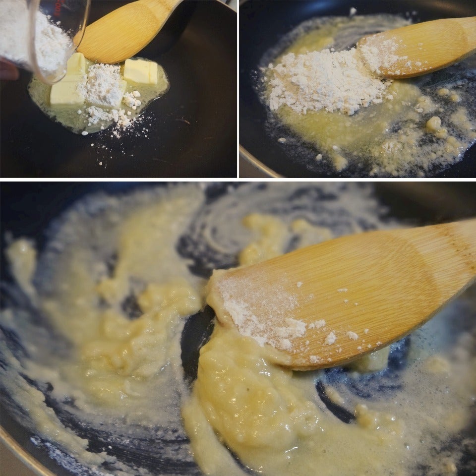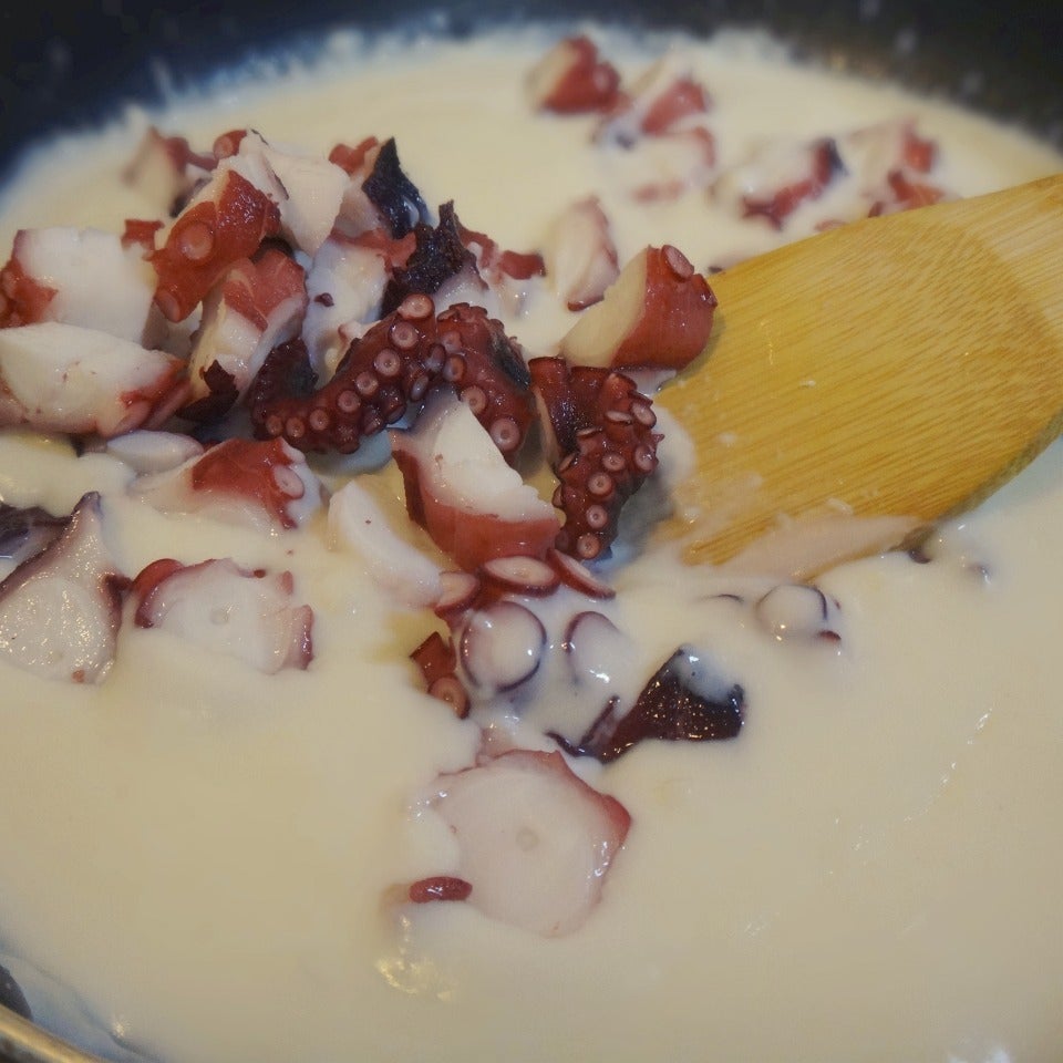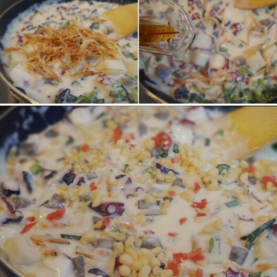ダマにならないように牛乳を足し潰し なめらかな たこ焼き粉のホワイトソースを作ります。