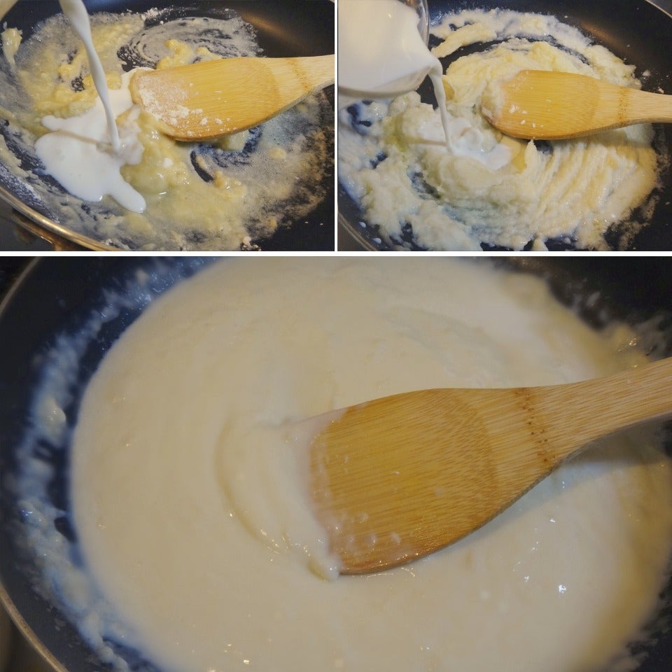 弱火で、牛乳を少量入れ、①を潰しながらよくかき混ぜ 繰り返し行い、