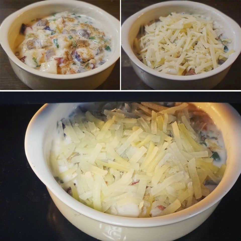 フライパンとオーブンレンジで焼いてスプーンで食べる たこ焼きグラタンです。