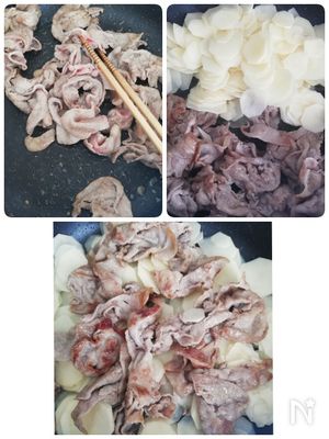 フライパンに油を引いてにんにくチューブと豚肉(豚こまや切り落とし)を入れて塩コショウして炒めます。豚肉に火が通ったら豚肉をフライパンの端に寄せます。フライパンの空いている所にじゃがいもを入れます。豚肉をじゃがいもの上に乗せてじゃがいもをフライパン全体に広げます。 -