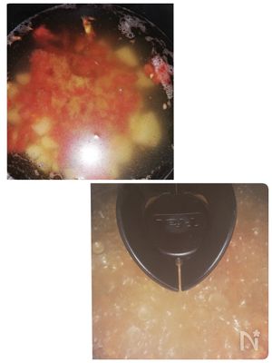 お鍋にトマトとじゃがいも、水、コンソメを入れて煮込んだらシーフードを入れて調味料で味を整えるだけ!