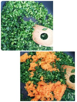 フライパンに油を引き(分量外です)大根葉を炒めます。大根葉に油が回ってしんなりしたら人参を入れて炒めます。