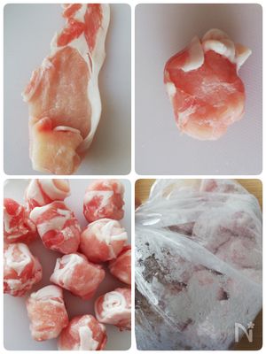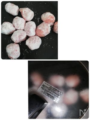 ポリ袋に片栗粉と豚肉ボールを入れて振り、まんべんなく片栗粉をまぶす。