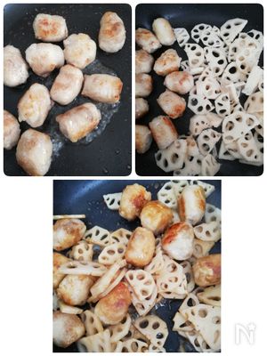 お餅を豚肉で包んだ肉団子に、子達の好きなれんこんを合わせてみた1品⤴⤴✨