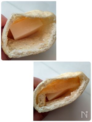切り落とした油揚げを餅の上に入れる。- 🔶お餅の上に切り落とした油揚げを乗せることでとろけたお餅が出ない様にしています。心配な場合は爪楊枝でとめて下さいね。