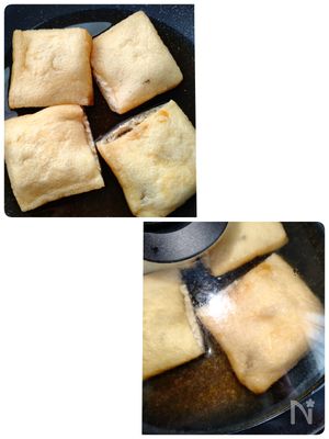 フライパンに油揚げとA水 200cc、めんつゆ(4倍濃縮) 大さじ3、みりん 大さじ1