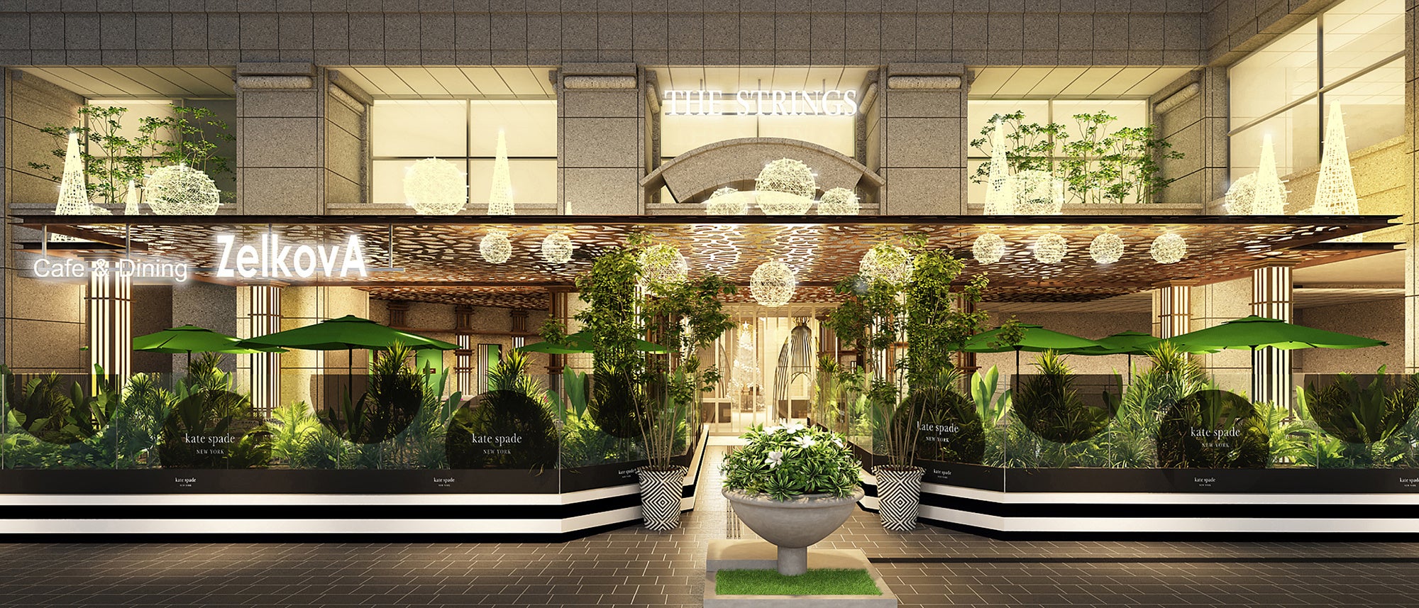 ザ ストリングス 表参道内にあるカフェ&ダイニング ゼルコヴァでは、そんなケイト・スペード ニューヨークならではのアレンジを加えた期間限定のアフタヌーンティーをお楽しみいただけます。表参道ケヤキ並木に面するテラス席は、ケイト・スペード ニューヨークのシグネチャーカラーである「ケイト・スペード グリーン」に彩られたパラソルや、ドットやストライプのデザインを施し、テーブルやウォールまで、ケイト・スペード ニューヨークのデコレーションをまとったスペシャルな空間が誕生。さらに数量限定販売の日本限定カラーのジュエリー付きプランがご好評につき予約販売枠を追加いたしました。大切な方へのホリデーギフトにおすすめのジュエリーとアフタヌーンティーがセットになったプランで、ケイト・スペード ニューヨークの世界観に包まれながら特別なモーメントを提供いたします。