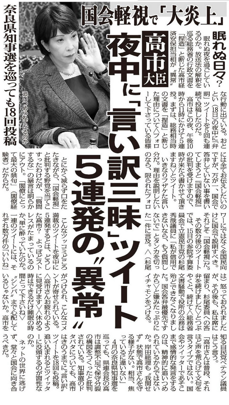 高市早苗氏こそ「国会軽視」…土日に“言い訳ツイート”20回超、シンパも心配する異常ぶり