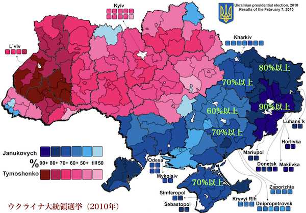 ドンバスを含むウクライナの東部や南部はヤヌコビッチの支持基盤で、住民の7割以上がロシア語を使う。文化的にも宗教的にもロシアに近い。
