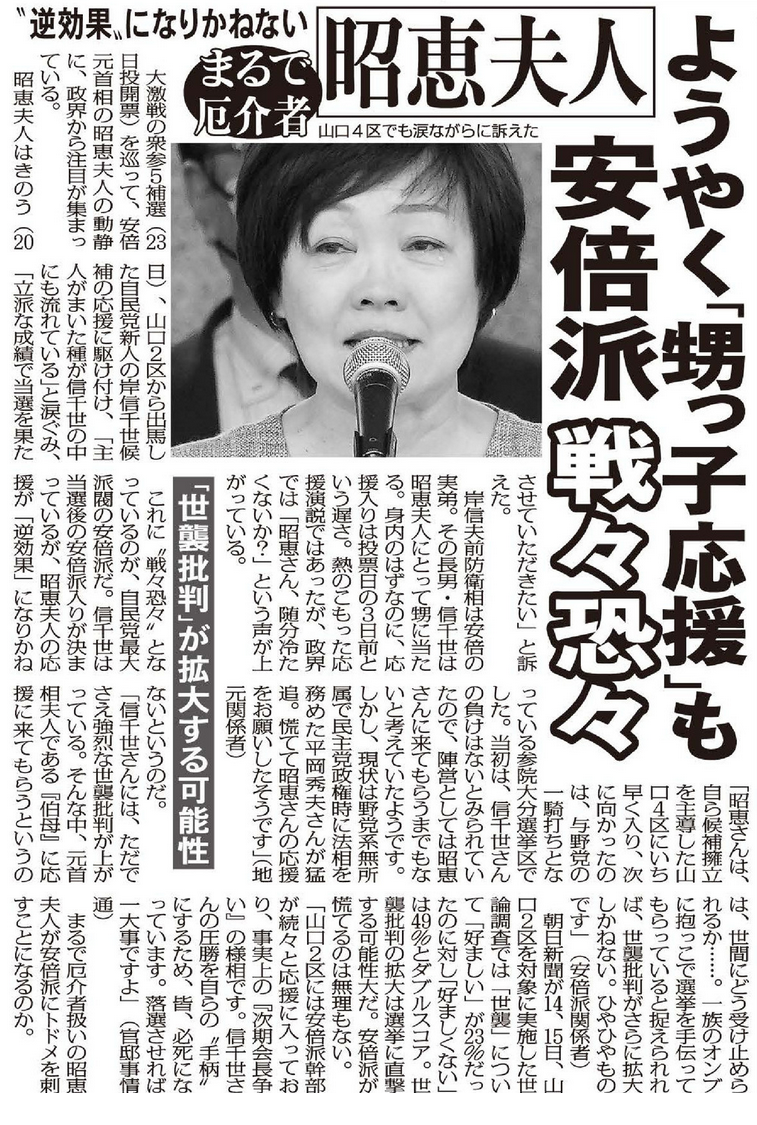 昭恵夫人は20日、山口2区から出馬した自民党新人の岸信千世候補の応援に駆け付け、