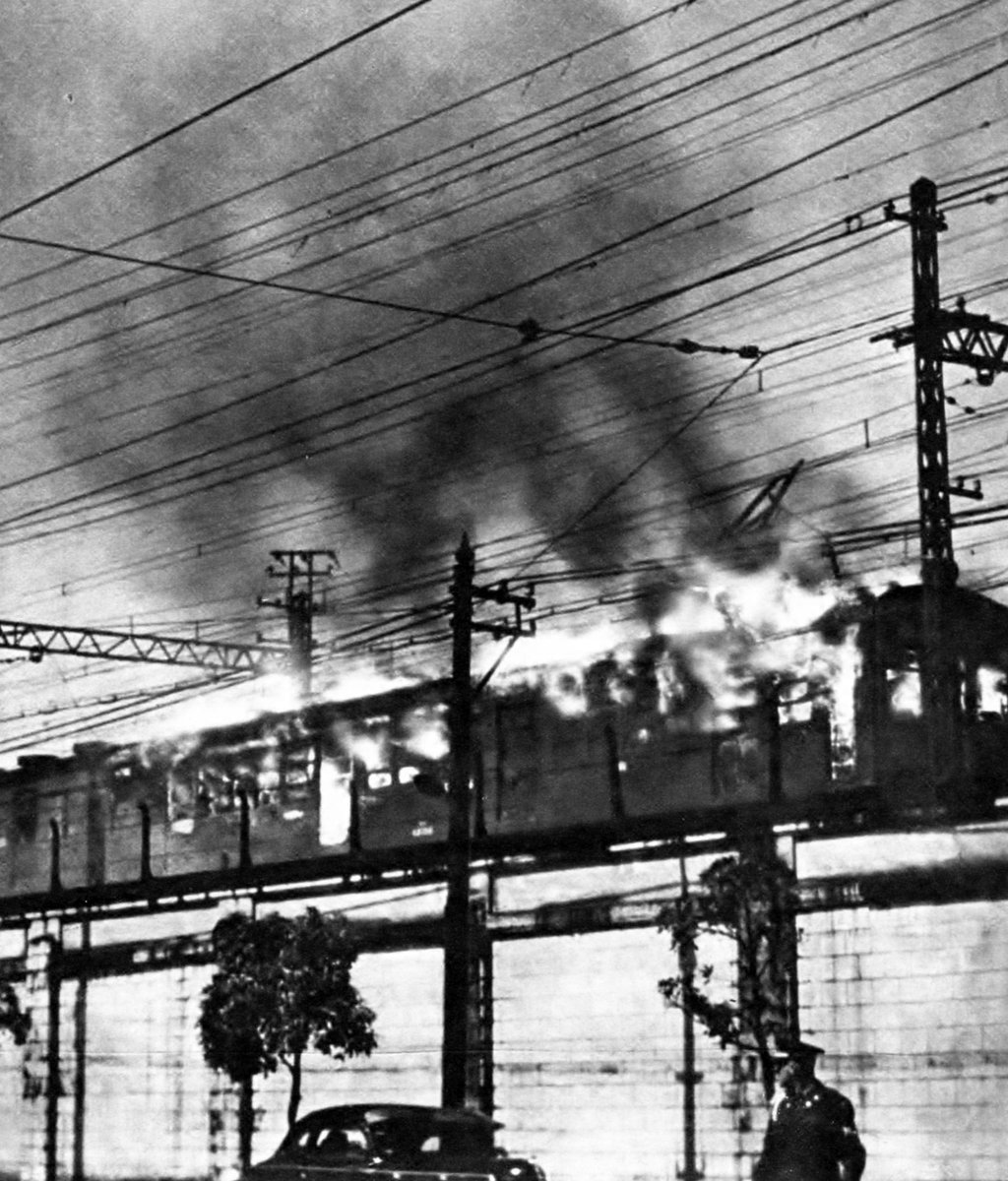 1951年4月24日 昭和26 桜木町事故。13時45分、国鉄京浜東北線・桜木町駅で、切れた架線に電車のパンタグラフがからまって発火、前2輛が全焼。死者106人。この事故を契機として非常用ドアコックの設置他電車の構造の抜本的改良が進むことに。