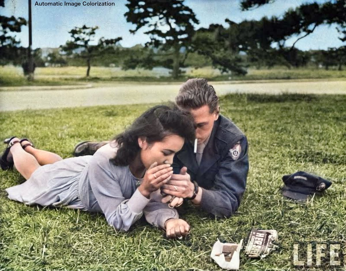 終戦の翌年,1946年に撮影された,煙草をシェアする進駐軍の兵士と 日本人女性のカップル。これは禁じられた行為だった。