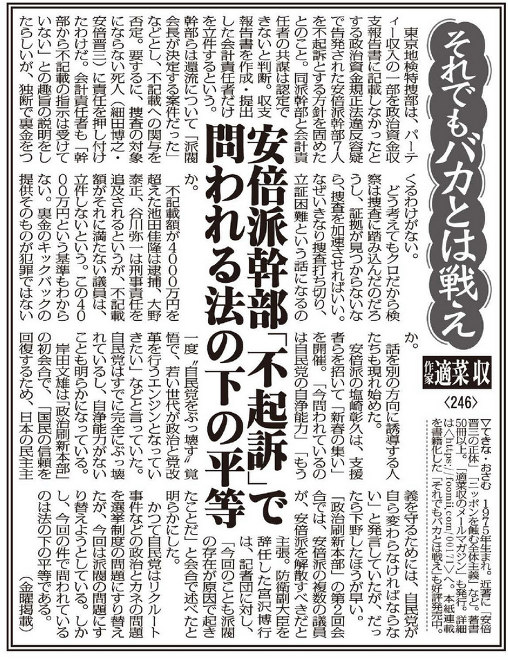 @聖地「八王子死守」壺議員。裏金事件で安倍派幹部7人「不起訴」… 問われているのは「法の下の平等」