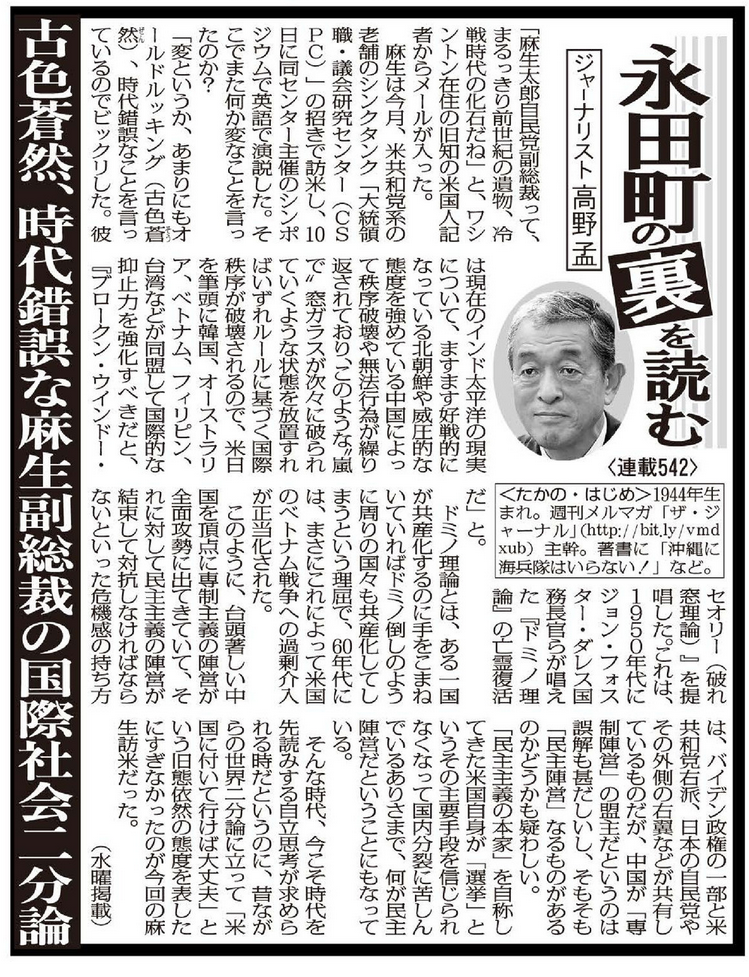 自民党・麻生副総裁の国際社会二分論