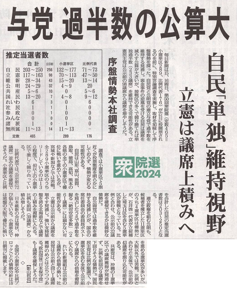 自公両党では過半数を維持する見通しですが、