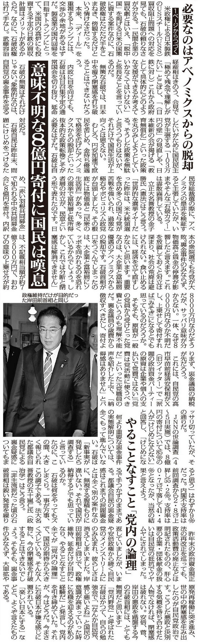 「選択肢としてあるだろう」と述べた。同時に、「何のためにというのがない大連立は『大政翼賛会』になってしまう」とも述べ、慎重な姿勢を示した。 収録は昨年12月24日に行われた。首相は立憲民主党の野田代表や日本維新の会の前原共同...