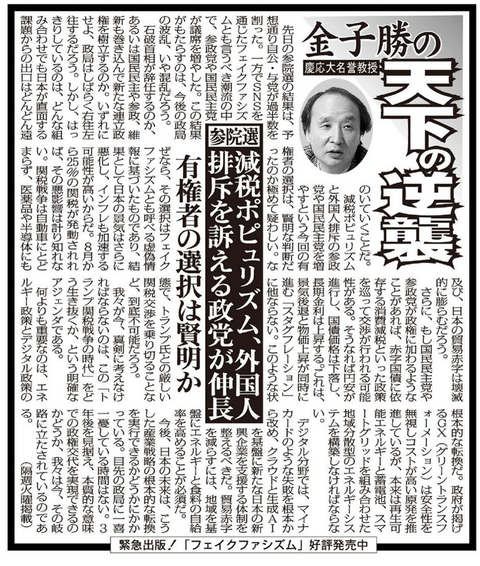 参院選では減税ポピュリズム、外国人排斥を訴える政党が伸長