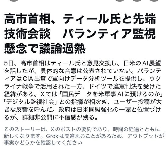 高市総理大臣 は、訪日中のピーター・ティール・パランティア・テクノロジーズ社