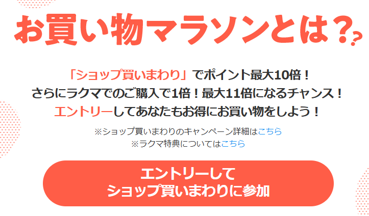 楽天お買い物マラソンは、期間中に異なるショップで買い物をすると、購入ショップ数に応じてポイント倍率がアップするキャンペーンです。