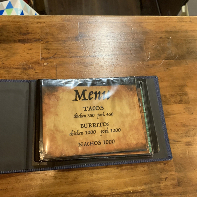 今回はタコス×2、ブリトー×2、ナチョス、ドリンク2杯のコースを頼みました。