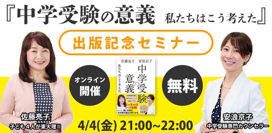 「中学受験の意義」出版記念セミナー佐藤亮子さん、安浪京子さん出演! 中学受験を考えるあらゆる学年の親御さん必見『中学受験の意義 私たちはこう考えた』出版記念セミナー開催!【参加費無料】 本セミナーで... powered by Peatix : More than a ticket.jyukenigi.peatix.com