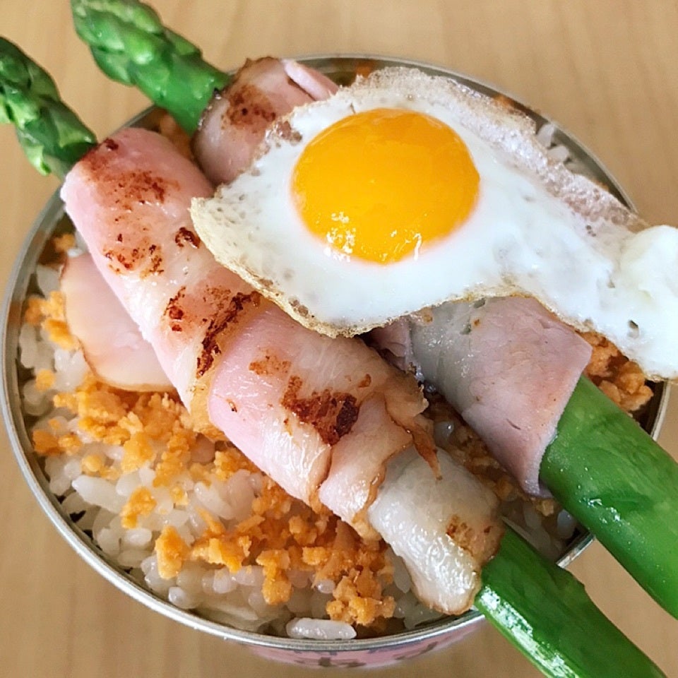 フライパンで焼く。その際に一緒にうずらの目玉焼きも焼く。あずき缶にご飯を詰め、しゃけフレークを散らばして、焼いたアスパラベーコンと、