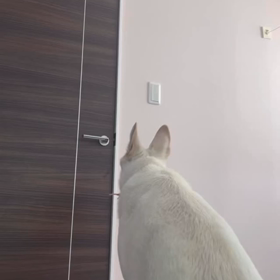 人間のように扉を開ける犬。